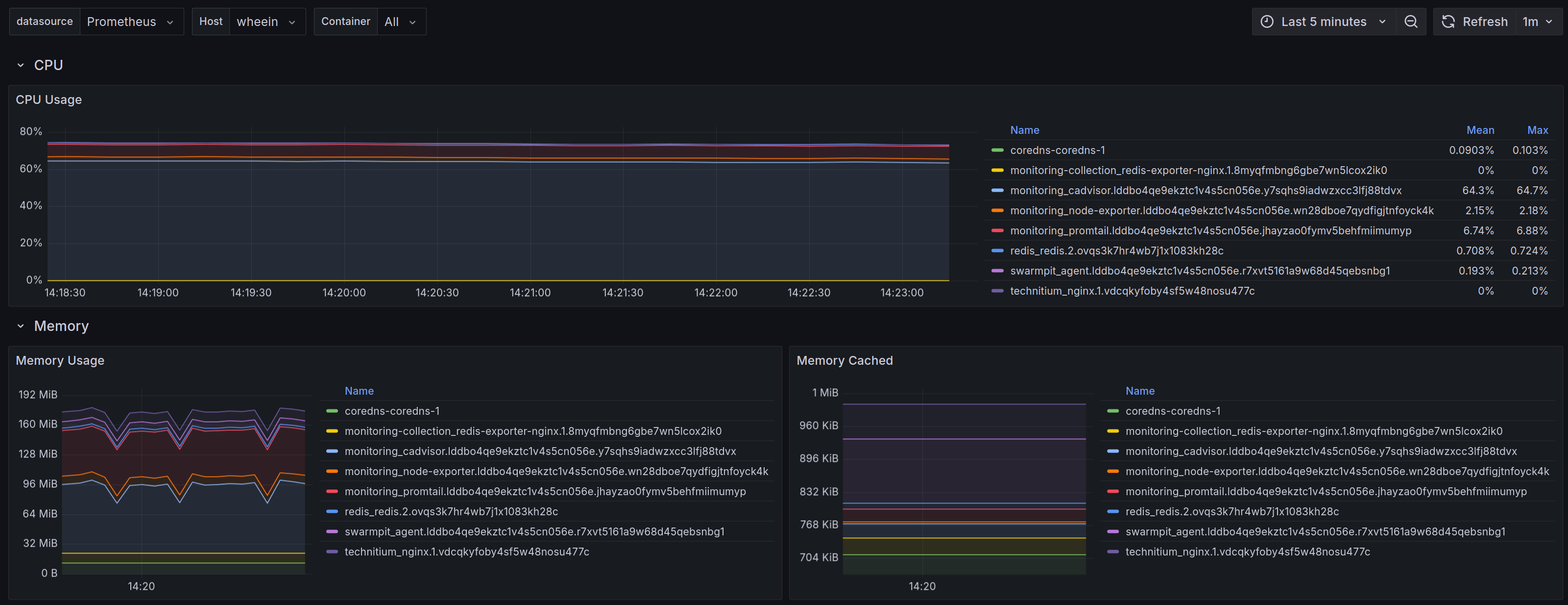 Collecting logs is great, but when it's the only point of visibility, the only information that can be gleaned at-a-glance is whether the node is up or not. After some more research, I settled on cAdvisor and node_exporter to expose metrics, and Prometheus to collect them. Conveniently, there are also Grafana dashboards for them as well.